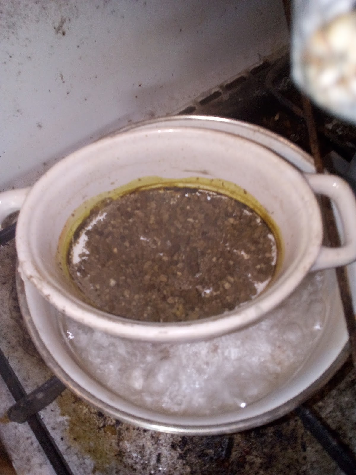 Dans un ballon : de la glaise naturelle avec des morceaux de nodules , le tout surnagé d'eau christique.